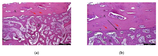 Histological analysis of the AG at 60 days. (a) Autogenous bone graft (A) in contact with the newly formed bone (B), and anucleated cells suggesting the presence of osteoblasts (red arrows). Hematoxylin and eosin stain at a magnification 40×; (b) Autogenous bone graft (A) and newly formed bone (B) separated by a cement line (black arrow) and osteocytes (red arrows). Hematoxylin and eosin stain at a magnification 125×.