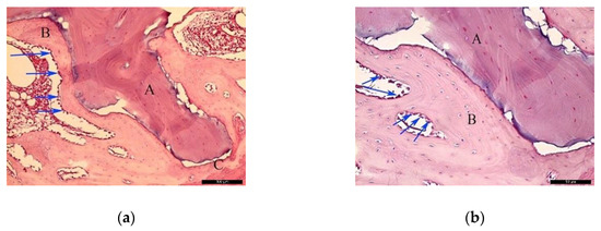 Histological analysis of the biomaterial group (BG) at 30 days. (a) Biomaterial (A) in close contact with the newly formed bone (B), and the residual recipient site (C); osteoblast-like lining cells are indicated with blue arrows. Hematoxylin and eosin stain at a magnification 40×; (b) Biomaterial (A), newly formed bone (B), and lining osteoblast cells in the periphery of the newly formed bone (blue arrows). Hematoxylin and eosin stain at a magnification 125×.