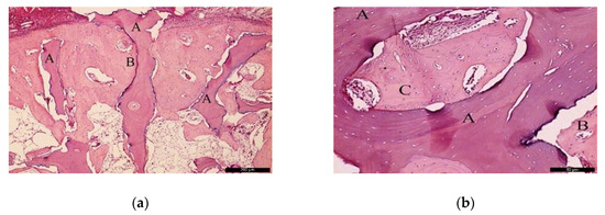 Histological analysis of the BG at 60 days. (a) Biomaterial (A) enwrapped by newly formed bone (B). Hematoxylin and eosin stain at a magnification 40×; (b) Biomaterial (A) on the recipient bed (B), and newly formed bone (C). Hematoxylin and eosin stain at a magnification 125×.