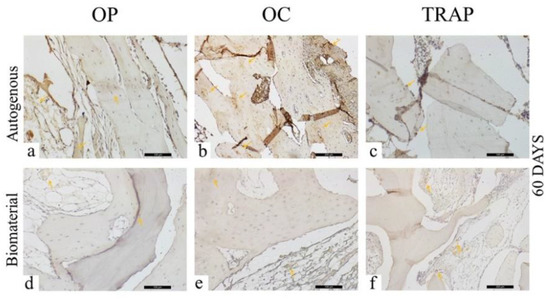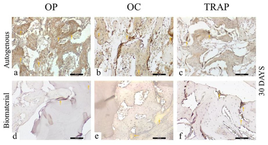 For the BG, light (++) staining was observed for osteopontin, osteocalcin, and TRAP, showing few cells stained for each of these proteins (Figure 8d–f). Regarding osteopontin and osteocalcin, which are extracellular matrix proteins presenting staining on the mineralized matrix, the low mineralization activity for both proteins in this later period stands out. There were also few TRAP stained in the region of interest.