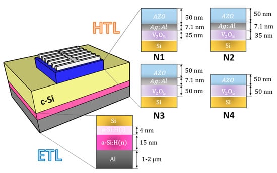 As for the primary study the above conclusions were used, four different solar cell architectures (i.e., N1, N2, N3 and N4) were fabricated using different thicknesses for the V2O5 layer (25 nm, 35 nm, 50 nm and 50 nm respectively) as the hole-selective contact. Out of these, for N1, N2 and N3 cells V2O5/Ag:Al/AZO multilayer acted as hole transport and transparent conducting layer, while in N4 cell structure it was AZO/ V2O5 multilayer, i.e., without the metallic layer Ag:Al. For these studies the thickness of the AZO and Ag:Al layer was kept constant at 50 nm and 7.1 nm respectively. The thickness of the layers was chosen from the electrical, optical, and topographical aforementioned studies on the films of AZO and Ag:Al.