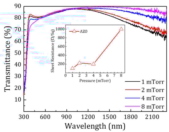 Films were studied with varying pressure, keeping the temperature (100 °C) and power (150 W) as constant deposition parameters. A huge decrease in sheet resistance from kΩ/Sq to around 100 Ω/Sq was observed in the films by reducing the deposition pressure from 8 to 1 mTorr. This effect could be explained by the formation of oxygen vacancies or a higher hydrogen reduction of the films. This agrees with the steady decrease in the infrared transmittance of the films (see Figure 2) as the deposition pressure is reduced [,]. Transmittance measurements for the AZO films indicate that all the films grown at different pressures show an average transmittance of 80%. The transmittance of the films in the visible range was independent of the pressure as shown in Figure 2, whereas the inset shows the drop in sheet resistance as a function of the deposition pressure.