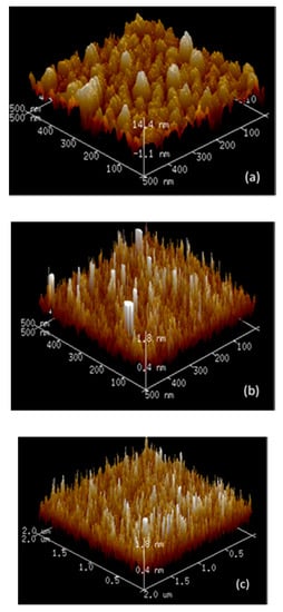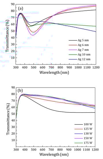 To obtain ultra-smooth Ag-based films with reduced RMS roughness, electrical continuity and higher transmittance, Ag:Al films were prepared by co-sputtering of Al with Ag. Al doping enhances the density of heterogeneous nucleation sites, thus larger nuclear density and smaller particle size []. First, Ag:Al films were optimized for Al doping concentration with a constant power on Ag target. Figure 3b shows the transmittance of films deposited at varying powers of Al from 100 W to 175 W keeping constant the power of Ag 100 W. The higher transmittance and lower sheet resistance were obtained for the Ag:Al films sputtered at 138 W, with a transmittance of 75–80% in the visible region and a sheet resistance of 60 Ω/Sq. All other films showed higher sheet resistance.