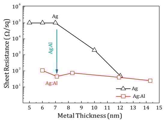 Sheet resistance with the increasing thickness of Ag and Ag:Al films are shown in Figure 7. The Ag films with thickness less than 7 nm behave as insulators with a high sheet resistance of 105 Ω/Sq. Ag:Al films of similar thickness show a sheet resistance of several 100 Ω/Sq. The huge drop in sheet resistance in Ag:Al films was due to the enhanced density of heterogeneous nucleation sites, avoiding the formation of isolated islands in the films []. The calculated resistivity of the Ag:Al films was comparable to the bulk resistivity of Ag films, confirming the uniform nature of the films.