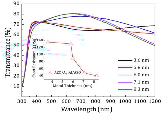The influence of the Ag:Al layers on the AZO/Ag:Al/AZO structures was investigated by studying the electrical and optical properties of the multilayers. Figure 8 shows the transmittance spectra for various metal thicknesses and the inset displays the sheet resistance as a function of metal thickness for AZO/Ag:Al/AZO multilayer.