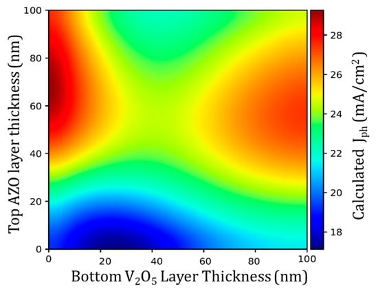 Mapping of the photogenerated current Jph under AM 1.5 irradiance as function of top AZO and bottom V2O5 thicknesses. The Ag:Al intermediate layer thickness was fixed at 7.1 nm. AZO layer between 50 and 60 nm thickness and V2O5 layer between 20 and 50 nm thickness shows better optical performance.