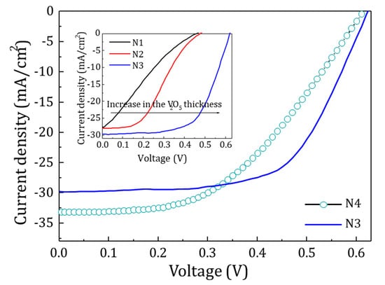The J-V curves of devices N1, N2 and N3 showed that as the thickness of the V2O5 layer increased, there was a huge increase in the Voc from 459 mV to 631 mV and in the fill factor (FF) from 22 to 61% (inset of Figure 10). This variation could be explained by the formation of defects in the V2O5 layer during sputtering because of Ag and Al ion bombardment. As the thickness of the V2O5 layer increases the damaging effect decreases and the inversion layer made by V2O5 becomes sufficient to improve the Voc and other parameters of the cell. N4 device was fabricated with 50 nm thickness of the V2O5 layer, hence reducing the bombardment defects and improving the optical parameters. This device without the Ag:Al metallic layer shows a Voc = 614 mV, Jsc = 33.1 mA, FF = 47.5% and an efficiency η = 9.6% (Figure 10). The device N3 with same thickness of V2O5, shows Voc = 631 mV, Jsc = 29.8 mA, FF = 61.2% and η = 11.5%. These increases in Voc, FF and η in the device N3 could be directly attributed to the presence of the metallic Ag:Al layer which decreased the sheet resistance. All devices were measured under a simulated AM 1.5 irradiance of 100 mW/cm2. The photovoltaic parameters of all the cells are given in Table 2.