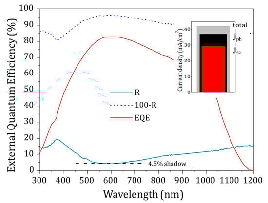 External quantum efficiency (EQE) of the solar cell with its reflectance spectrum are plotted in Figure 11. The EQE dropped at long wavelengths photon energies lower than the Si bandgap (λ > 1100 nm). On the other hand, at short wavelengths (λ < 500 nm) the EQE was reduced because of the absorption in the front layers (DMD) and recombination at the front interface. A balance of the current entities calculated by integrating the solar spectrum is computed in the inset, taking into account optical and internal recombination losses.