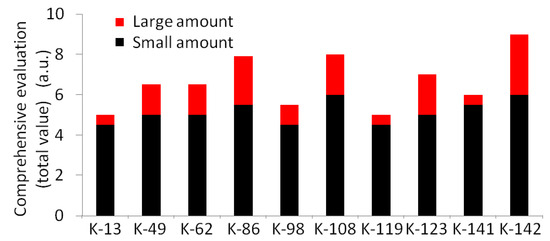 Table S3 shows the digitizational results of small amount synthesis of the target strains (the 24 strains selected from the first round) in the second round. Ten strains (K-19, K-32, K-67, K-87, K-149, K-166, K-167, K-237, K-255, and K-268) showed results of 0 a.u. It was considered that these 10strains produced color changes in the first round because of the promotion of synthesis by medium components. So, we judged that they were “unable to synthesize Au nanoparticles”. Four strains (K-29, K-90, K-140, and K-165) with a total of 0.5 a.u. to 4.0 a.u. were evaluated as having poor reproducibility for the small amount of synthesis. The remaining 10 strains with results of 4.5 a.u. or more (K-13, K-49, K-62, K-86, K-98, K-108, K-119, K-123, K-141, and K-142) were evaluated as having good reproducibility for the small amount of synthesis and we continued to do a large number of synthesis experiments with these 10 strains. Table S4 shows the digitizational results of a large amount of synthesis. The total value of the digitizational results of small and large amounts of synthesis as the comprehensive evaluation of each strain was recorded (Figure 1). K-142 was the strain with the highest total value, with 7 times the amount of small amount synthesis and 3 times of the amount of large amount synthesis compared to the other strains. Therefore, it was considered that the strain K-142 has a good reproducibility when synthesizing Au nanoparticles, and has the highest synthetic ability among the strains. K-142 was considered to be the excellent strain that we want, and was used as the target strain in the following experiment.