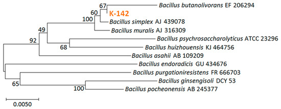 The 16S rRNA sequence of the screened strain K-142 of was obtained by PCR using universal primers and DNA sequencing. As the result of the identification of the genus, the score was 100%, indicating that K-142 belongs to the Bacillus genus. We obtained 10 species with high homology from the strains registered as type species in NCBI using RDP, and created a phylogenetic tree by the neighbor-joining method using MEGA software. The results of phylogenetic tree analysis are shown in Figure 2. It showed that Bacillus butanolivorans was the closest species to K-142. As the result of observing the shape of the cells with an optical microscope, we found that K-142 appeared as bacilli (Figure S7). In the long-term culture, we found that the colony of K-142 is very viscous and that K-142 is not easy to separate from liquids such as water and liquid culture. In the daily culture process, we found that the colony of K-142 is larger and thicker than other strains in the same cultivation time, and the colony of K-142 can be stored at 4 degrees for about half a year but would still synthesize Au nanoparticles normally (data not shown).