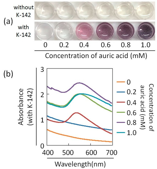 UV-Vis spectra were measured in the wavelength range of 400 to 700 nm for a solution with different concentrations of auric acid, which was marked as “with K-142” in Figure 3a (Figure 3b). The absorption maximum wavelength of the solution that turned purple was about 550 nm, which was in agreement with the characteristic wavelength of the SPR of Au nanoparticles.