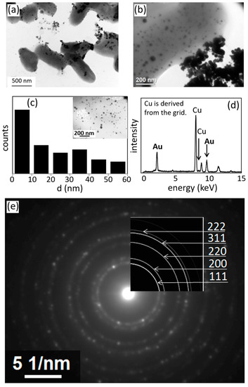 Figure 4a,b show the TEM images of the K-142 cells and the synthesized nanoparticles. Circular and triangular black dots were observed around the gray cells. Based on the analysis of the elemental composition of the black particles in Figure 4a,b with the attached EDS device (Figure 4d), the synthesized nanoparticles consisted of Au elements. Figure 4e shows the electron diffraction pattern of nanoparticles synthesized by K-142 cells. It also shows the ring pattern of Au crystals. We calculated the area of the nanoparticles seen in the picture in the upper right corner of Figure 4c, and created a histogram of their diameters. From the results shown in Figure 4c, the particle sizes were distributed in the range of 10–60 nm, and the average particle size was 25.9 ± 5.5 nm.