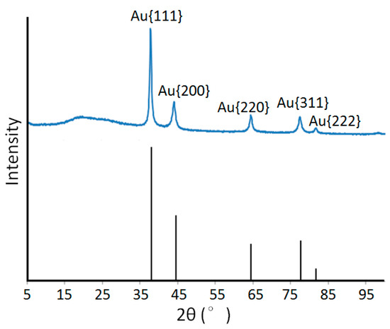 We freeze-dried the bacterial cells (synthesized with Au nanoparticles) overnight, crushed them with a pestle/mortar, and placed them on a non-reflective plate made of single crystal silicon for the measurement. The XRD pattern of the obtained K-142 powder and the spectrum of the Au crystal obtained from AMCSD (the American Mineralogist Crystal Structure Database) [24] are respectively shown in Figure 5. Peaks were detected at 2θ = 38.2°, 44.4°, 64.6°, 77.6°, and 81.8°. These peaks coincided with the peaks in the crystalline surface at {111}, {200}, {220}, {311}, and {222} of Au registered in the database. This means that the nanoparticles synthesized by K-142 are Au crystals.