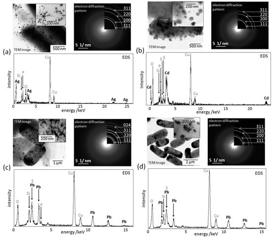 TEM images, electron diffraction patterns of the synthesized particles, and EDS of the synthesized particles of the samples after the addition of a different metal salt solution. (a) AgNO3 (final concentration 3.0 mM). (b) CdSO4 (final concentration 0.2 mM). (c) Pb(NO3)2 (final concentration 0.2 mM). (d) Pb(NO3)2 (final concentration 0.5 mM). The results of the electron diffraction patterns and EDS showed that the synthesized nanoparticles were (a) Ag crystals, (b) CdS crystals, and (c,d) PbS crystals.