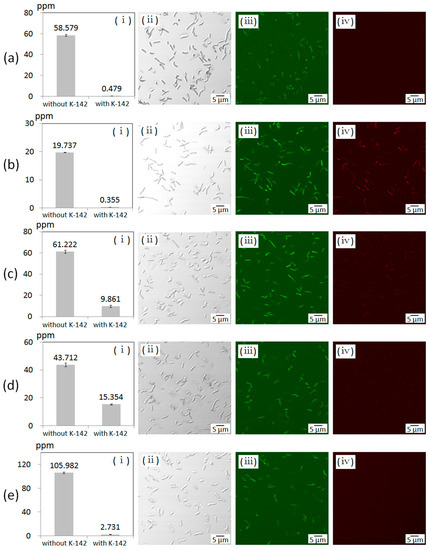 When AlCl3 was added to the K-142 culture solution, both green and red fluorescence were observed, indicating that the bacterial cells were dead (Figure 8b(iv)). With the addition of CdSO4, signals were observed in green fluorescence and red fluorescence but the signals in red fluorescence were very weak, suggesting that they may be alive but their vitality has decreased (Figure 8c(iv)). In the presence of AgNO3, CuCl2 and Pb(NO3)2, only green fluorescence was observed. On the other hand, there was no red fluorescence signals at all (Figure 8a(iv),d(iv),e(iv)). From these results, the bacteria K-142 could be seen to be completely alive under the condition of Ag, Cu, and Pb ions.