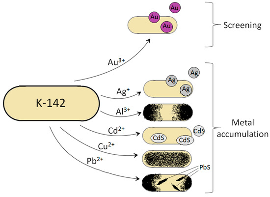 In this study, we successfully screened microorganisms with a strong ability to synthesize Au nanoparticles from environmental water. Through the identification of selected strain from more than 282 strains, it was confirmed that the selected K-142 is the bacterium belonging to the Bacillus genus. K-142 induced the synthesis of Au nanoparticles that have a 25.9 nm average size. K-142 can not only synthesize Au nanoparticles, but can also synthesize Ag, CdS, and PbS nanoparticles, and showed the excellent deposition efficiency of the several metal ions such as Ag+, Al3+, Cd2+, Cu2+, and Pb2+ (Figure 9). In addition, the results of fluorescent staining showed that K-142 could survive after being treated with a metal solution for 1 day. Therefore, K-142 is expected to be useful for bioremediation due to its ability to synthesize Au and other metal nanoparticles and its excellent ability to accumulate metals.