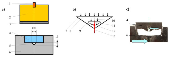 The plasma jets generator with a conical cavity: (a)—device diagram: 1—detonator; 2—explosive; 3—metal plate; 4—metal piston; 5—conical cavity; 6—steel matrix; (b)—the scheme of possible shock-wave flows in a conical hollow: 7—the direction of the particle motion; 8—the surface of the plate; 9—Mach shock wave; 10—the front of wave entering the cavity; 11, 13—plasma jets; 12—the collision of plasma streams; (c)—the jets burning-through the barrier; the formed cavities are indicated by the arrows; dimensions are given in mm.