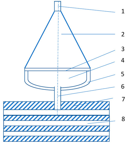 The pressure of 90–100 GPa in the “piston” is the result of the impact of the metal plate. Depending on the pressure in the “piston” and accordingly to the shock wave velocity entering the conical chamber, the flow of dense plasma is formed. Approaching the top of the conical chamber, the plasma flows collide resulting in the formation of high-energy plasma jets directed toward both the target and the “piston,” that is in opposite directions (Figure 1b). In plasma commutation, there is the relationship between flow rates (velocity), pressure and temperature. Previous studies have shown a fairly wide range of the results of these parameters. Unfortunately, it is not possible to take them all into account. For our study, the analysis was taken according to the known approaches, consisting in allocation of characteristic points which will establish the basic properties of work of the entire system [1,3,15]. The velocity of the jet penetration into the target is estimated at ~27,800 m/s. Using the method of calculating the parameters characterizing the ultra-high-speed cumulation, the estimate of the jet pressure is ~34.5 TPa, whereas the minimum estimated temperature is 1.3 × 106 K.