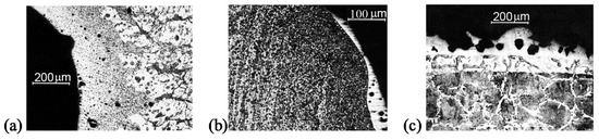 Microsection of metal surface layers after the impulse heating of the surface in contact with plasma from the explosive generator: (a) and (b)—the microstructure adjacent to the surface of the “piston” (a) and holder (b), respectively; (c)—the micro-section of the metal wall cut exposed to the plasma thermal shock.