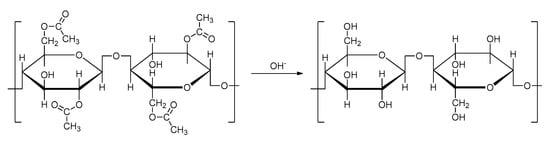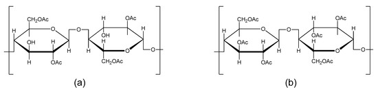 Cellulose and its derivatives are attracting increasing attention as renewable, economical, and abundant resources to reduce dependency on fossil resources [1,2,3]. Cellulose acetate has been recognized as by far the most important derivative of cellulose because of its versatile industrial and commercial applications [4,5]. Acetate fibers are synthetic cellulosic fibers manufactured by treating cellulosic biomass, such as pure wood pulp or cotton linters, with a mixture of acetic anhydride and acetic acid at a low temperature in the presence of a catalyst such as sulfuric acid, perchloric acid, zinc chloride, or similar salts [6]. The cellulose hydroxyl groups are esterified by the acetic anhydride to form cellulose acetates—the fiber forming components. Cellulose acetate is majorly classified into two types: cellulose triacetate and cellulose diacetate, with acetylation degrees of 3.00 and 2.48, respectively (Figure 1) [7,8].