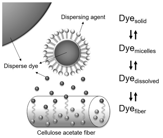 Cellulose diacetate fibers are widely used in the apparel industry because of their superior properties, such as silk-like softness, luster, comfort, and good draping quality. However, dyes with satisfactory properties—non-toxicity, environmentally friendliness, and high color fastness, have been a major impediment in their use in the textile industry. Due to their hydrophobic nature, efficient dyeing requires the use of dyes with limited water solubility; disperse dyes are sparingly soluble in water and are almost exclusively used for cellulose diacetate fibers. The insolubility of disperse dyes enables them to transfer from water to the surface of hydrophobic fibers, and the application of heat to the dye liquor accelerates the disperse dye’s diffusion into the interior of the fiber above its glass transition temperature (Figure 2) [8].