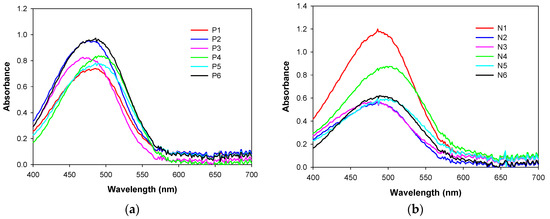 As shown in Table 2, N-dye series exhibited higher extinction coefficients and half-band width, and therefore gave greater tinctorial strength as compared to P-dye series. The UV–Visible spectra of the synthesized dyes in ethanol solution are shown in Figure 3. Regarding the spectral properties of the synthesized dyes, the color ranges of P-dye series and N-dye series were almost identical, both of which fall into the color gamut of orange to red (477–499 nm). However, the extinction coefficient (εmax) and half band-width (Δλ1/2) were at different levels. Among the P-dye series, P2, P3, and P6 showed very similar extinction coefficients to their analogs in N-dye series. Therefore, we can expect P2, P3, and P6 will exhibit a relatively reasonable level of build-up properties. The value of half band-width is a useful criterion for the evaluation of the hue brightness of dyes [16]. Dyes with low half band-width have bright hues, while those with high half bandwidth have dull hues. Comparatively, P-dye series has lower half band-width than N-dye series; thus, they are expected to have higher chromaticity on the dyed cellulose diacetate.