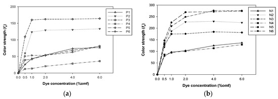 Build-up properties of the synthesized dyes on cellulose diacetate: (a) P-dyes. (b) N-dyes.