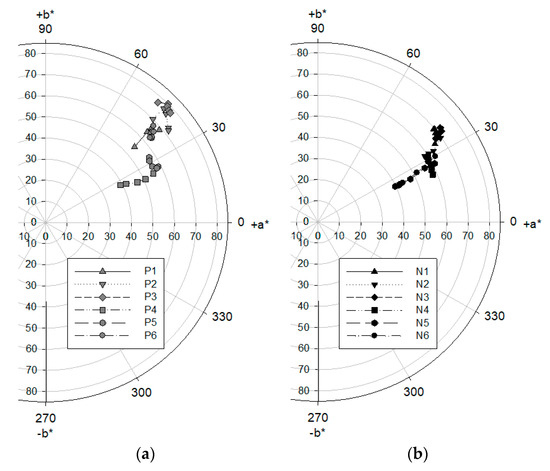 CIELAB color coordinates (a* and b*) of the cellulose diacetate fibers dyed with the synthesized dyes: (a) P-dyes. (b) N-dyes.