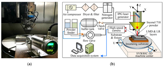 In this paper, the LMD and LMD + LR experiments of Inconel 718 superalloy were conducted in a SVW80C-3D (Hybridwise Technology Co. Ltd., Dalian, China) hybrid additive and subtractive machining center, which is primarily composed of YLS-2000 laser generator (IPG Photonics Corporation, Oxford, MS, USA), RC-PGF-D-2 powder feeder (Zhongke Raycham Laser Technology Co., Ltd., Nanjing, China), ET-80 air compressor (Jaguar Mechanical and Electrical Equipment Co., Ltd., Shenyang, China), DM-1.5H nitrogen generator (Demiao Technology Co. Ltd., Shijiazhuang, China), Heidenhain operating system (TNC640, Heidenhain, Berlin, Germany) and data acquisition system. The laser scanning speed can be adjusted by controlling the movement speed of the 3-axis laser cladding head, as shown in Figure 1a. Nitrogen gas is selected as protecting and carrier gas to deliver the powder to the substrate. In the LR process, the powder feeder is turned off to stop delivering powder when the laser generator works. Figure 1b illustrates the principle of LMD + LR processes.