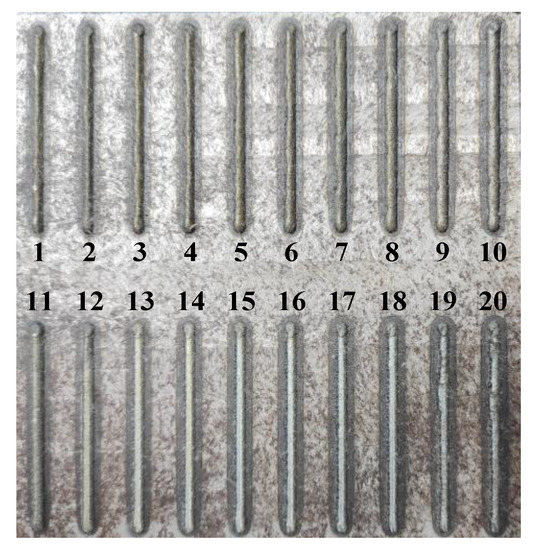 The previous studies have shown that laser power and laser scanning speed play an important role in the performance of LMD process [21]. In this research, the laser scanning speed of the LR process was selected as a single variable in a range of 360 mm/min to 1320 mm/min and the increment was 480 mm/min. Other constant parameters of the LMD process were set as follows: laser cladding power was 1000 W; powder feed rate was 13.5 g/min; laser scanning speed was 360 mm/min. Moreover, the distance from the focus of laser beam to molten pool (defocusing distance, ) was 13.5 mm. As each cladding layer had been deposited and solidified, LR treatment was followed and the remelting direction keeps constant with the LMD process. The laser remelting power was 1000 W. The formed LMD and LMD + LR samples in the experiments are shown in Figure 2, including 11 LMD layers (No. 1–11) with the same technological parameters and 9 LMD + LR layers (No. 12–20) which were divided into three groups by using the laser scanning speeds of 360 mm/min (No. 12–14), 840 mm/min (No. 15–17), and 1320 mm/min (No. 18–20), respectively.