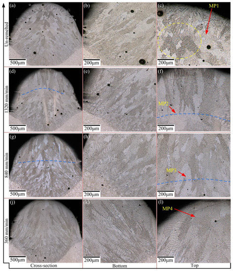 Dendrite morphologies of the cross section of the single-pass layers. (a–c) LMD; (d–l) LMD + LR: 1320, 840 and 360 mm/min respectively.
