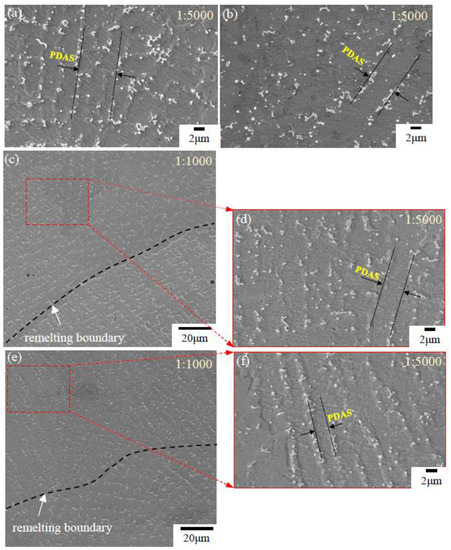 Microstructure morphologies and measured primary dendrite arm spacing (PDAS) on the cross sections of the single-pass layers. (a) MP1 in the LMD layer ( 360 mm/min); (b) MP4 in the LMD + LR layer ( 360 mm/min); (c,d) MP3 in the LMD + LR layer ( 840 mm/min); (e,f) MP2 in the LMD + LR layer ( 1320 mm/min).