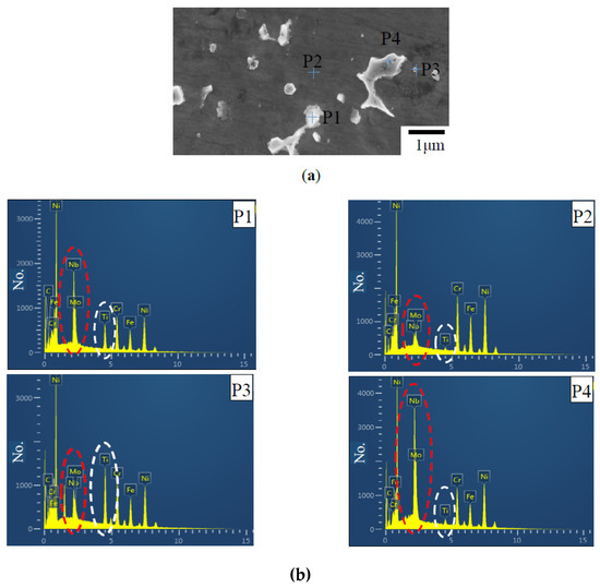 Furthermore, energy spectra of different precipitates (P1, P3, and P4) and gray matrix (P2) in the LMD + LR layer ( 360 mm/min) were measured and analyzed. Figure 6a displays the position of each probe point. Figure 6b and Table 2 show the elemental analysis results of different precipitates. The contents of element Nb and Mo in P1 are 19.04% and 7.75%, 6.2 times and 1.6 times higher than that in the gray matrix P2, 2.66% and 2.96%. Because of the enrichment of Nb and Mo, it can be judged that the Laves phase is mainly composed of the strip and irregular shaped precipitates such as P1 and P4. Based on the elemental result at P3, the globular precipitates are rich in C (9.07%), Ti (17.97%) and Nb (14.52%), especially the content of Ti reaches 25 times higher than that in the gray matrix P2, 0.69%. Thus, the globular phase can be identified as the MC carbides. According to the literature [22], the LMD process of Inconel 718 powders belongs to a non-equilibrium solidification and the microstructural evolution is L → L + γ → L + NbC/γ → L + Laves/γ. Nb is continuously ejected from the solid phase during the formation of dendrites because the solubility of Nb in solid phase is lower than that in liquid phase. As the solidification continues, the content of Nb increases obviously with the constant reduction of liquid phase in the molten pool. When the temperature of liquid phase reaches the eutectic point, the liquid phase transforms into Laves phase and γ phase. The white Laves phase is precipitated at the interdendritic regions. The edges of dendrites are visible due to the changing distribution of these bright phases. So, the morphology of the precipitates depends on the dendrites. Specifically, the strip-like Laves phase appears near the columnar dendrites and the network-like Laves phase appears near the equiaxed dendrites.