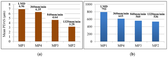 As for the primary dendrite arm spacing (PDAS), based on the SEM images of the precipitation structure in Figure 5, the PDAS was measured in 5 times at various positions on the SEM images for each laser scanning speed in order to obtain the mean PDAS values of Laves phase in MP1-MP4. As shown in Figure 7a, the mean PDAS values decrease from 6.35 to 3.28 μm gradually as increases from 360 to 1320 mm/min. Through comparison and analysis of the segregation phase content of the single columnar dendrite, it can be seen that a low laser scanning speed of LR process facilitates the precipitation of the Laves phase. To acquire the amount of Laves phase accurately, we adopted the image processing software ImageJ to analyze the images of the microstructure morphology (MP1–MP4) in Figure 4. A RenyiEntropy color thresholding method was used to mark the Laves phase and then the function of “Analyze Particles” was used to count the amount of Laves phase per unit area of 3.6 × 10−3 mm2. The results are shown in 7b and 8, which demonstrate that the amount of Laves phase is strongly influenced by the laser scanning speed. More specifically, based on Figure 7b and Figure 8a,b, the amount of Laves phase per unit area in MP4 of the LMD + LR layer is 615, 22.4% lower than that of the LMD layer, 793 as 360 mm/min. The Laves phase presents divergent distribution of dendrites because the energy density of the LR process is higher than that of LMD process with the same laser scanning speed and laser power. For the LMD process, the laser beam is always partially sheltered by the ejected powder, thus the energy density is lower than that of LR process. In the remelted layer, the concentration of Nb was restrained by large thermal gradient (rapid heating and cooling of molten pool) and more Nb was trapped in the gray matrix. Meanwhile, the flow of molten pool makes it more uniform in distribution of Nb, Mo, and Ti, which blocks the formation of Laves phase.