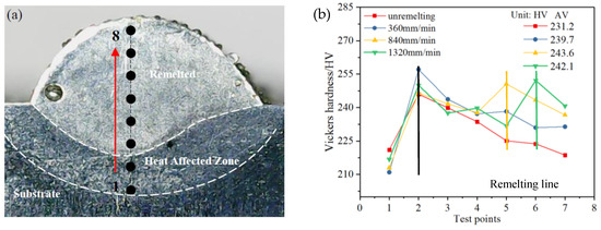 (a) The test points of the hardness on the cross section of the single-pass layers; (b) Vickers hardness results of the test points.