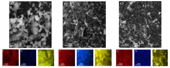 3.2. Scanning Electron Microscopy (SEM) Characterization of rGO Decorated with Au, Ag and CuNPs