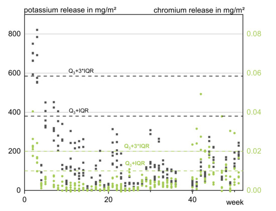 The complex interaction of the influencing factors resulted in a wide data distribution, exemplarily pictured in Figure 1 for potassium and chromium. It was therefore difficult to define criteria for a statistical outlier model.