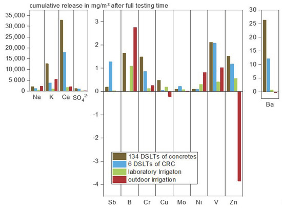 A tendency of the 4-layer, cracked surface specimens towards a higher release can be assumed for sodium, potassium, arsenic, copper, molybdenum, selenium, and vanadium from the outdoor results (see also Figure A1). Nevertheless this is not a significant difference and might also be a result of the multiply cracked specimens and thus an extended surface. This can be confirmed by the lab results from intact surfaces and also the differences in the total release of most substances from the specimens F 1gA with 2–3 cracks and F 1gB with only one crack. An influence from the carbon reinforcement and its SBR coating on the release of heavy metals and trace elements is therefore improbable.