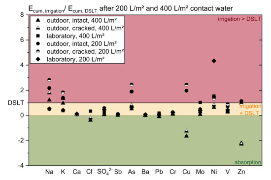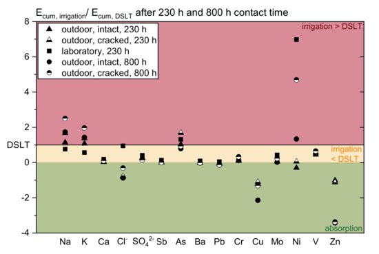 However, the Netherlands assess irrigated construction elements by using the DSLT and a transfer function that considers the reduced water contact time with a factor of 0.1 [26,27,28]. This method might not cover the worst case leaching conditions and therefore underestimates the actual emissions. Hecht and Schoknecht et al. for example showed that not only the duration of water contact, but also the transport during drying phases determines the emissions [24,29], the DSLT does not achieve realistic exposure conditions [30]. Still it is desirable to find or develop a horizontal and therefore universally applicable and easily adaptable concept for the assessment of the environmental compatibility of irrigated construction components. This concept could be used to recognize possible threats from the outset, and ensure a sustainable application of new building materials and composites.
