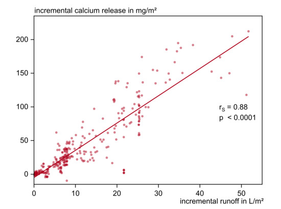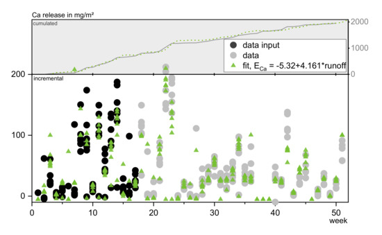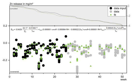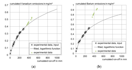 The runoff to emission correlation in COMLEAM can be described by five different functions, which were chosen on the basis of fitting existing mathematical descriptions with the prerequisite of a constantly decreasing slope. These functions are not necessarily describing the real physical processes. They are called: “Logarithmic function”, “emission function for limited growth”, “Langmuir emission function and Michaelis–Menten emission function”, “double logarithmic emission function”, and “diffusion controlled emission function” [32]. These functions were adjusted and parameterized to match the emission processes of irrigated building components. Another option to describe the runoff to emission correlation in COMLEAM is, to implement a dataset of measured runoff and corresponding cumulated emissions.