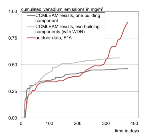 Emissions from intermittently wetted construction elements are difficult to predict and therefore also to assess as these materials experience a permanent wet–dry stress, which causes a deviating leaching behavior. Dry phases may lead to faster capillary transport and therefore an increased availability for leaching or wash-off in the following rain [24]. Also increased or lower release depending on the respective substance, chosen point in time, and reference value as, e.g., contact time or amount of water applied [18,25], and changing release patterns compared to permanent wet components [6,25] can be observed.