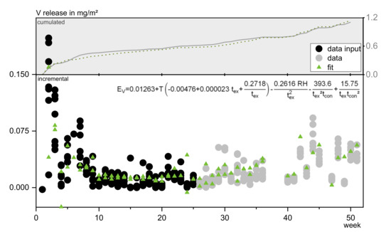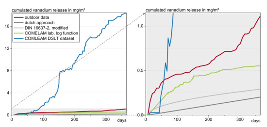 Following [13] and based on the determined concentrations of [25], the emissions and the cumulated release were calculated using Equations (1) and (2). For the outdoor experiments the concentrations of the blind test were subtracted from the concentrations of the eluates from the test specimens to compensate for the background concentrations in the rainwater and potential contamination from deposited particles.