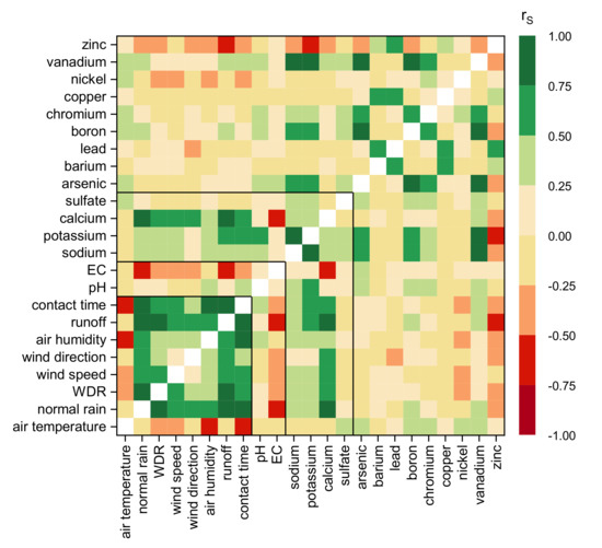 To evaluate the correlation between the weather data and the observed substance emissions as well as the mutual correlations between the substances, nonparametric correlation estimations on monotonic relationship after Charles Spearman [37] were conducted using the software SPSS version 25.0 and Origin 2019b. Due to the lack of normal distribution and the wide data range a parametric test (e.g., Pearson) was no option.