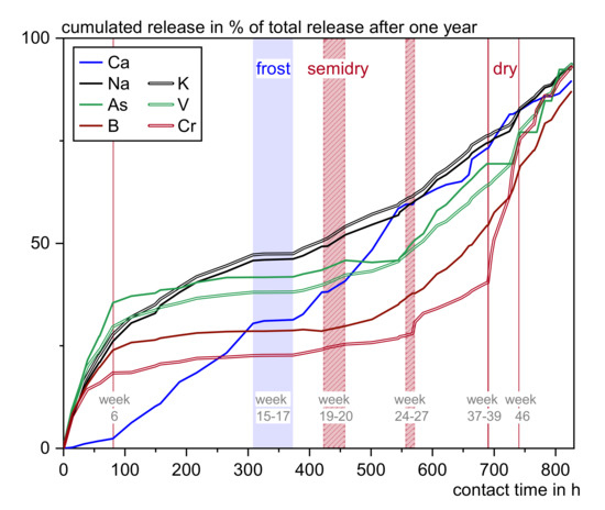 Table 3 shows the cumulative releases compared to the threshold values after [16] and to the threshold values for soil and groundwater protection of the Netherlands [42], which both apply to the DSLT results. As the German values are based on the assumption of a direct release into the groundwater and refer to the emission from the material whereas the Dutch consider soil retention and are set as immissions values, the Dutch thresholds are less rigorous and probably more suitable for irrigated construction elements.
