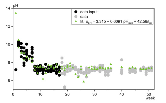 The test is considered as robust against wide ranges and outliers [39,40]. Nevertheless, the impact of the first months of exposure (see also Section 2.3) on the correlation factor rs was tested by running a second calculation leaving the first four weeks apart. An improved Spearman correlation value (rs) for 13% of the data was observed but 49% were downgraded. The influence on strong correlations was expectedly low so the full data set was used for further assessment.