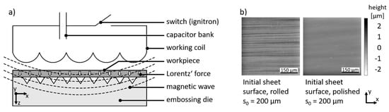 The used capacitor bank consisted of four parallel connections of a serial capacitor pair (overall eight capacitors) with an overall capacity of C = 100 µF. The maximum voltage of the capacitor bank, which was switched by a single ignitron, is Umax = 6 kV. The resulting charge energy of Emax = 1800 J was used for all experiments. The coil was a single straight conductor coil made of copper with a rectangular cross-section of 5 × 5 mm2. The resulting inductance of the setup was approximately 0.6 µH. The sheet material was Al99.5 with a thickness of s0 = 200 µm and 50 µm. The clearance between coil and the 50 × 50 mm2 sheet was about 0.2 mm. Between sheet and die was no clearance. The experimental embossing setup is illustrated in Figure 4. The surface of the sheets exhibited grooves caused by rolling as blank manufacturing process, see Figure 1b. The sheets were oriented in the embossing setup, that these grooves were parallel to the single straight conductor coil. Both sheets were processed with no further surface preparation. Additionally, one of the thicker sheet samples was polished. The list of experiments is summed up in Table 1.
