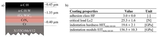 An industrial CemeCon magnetron sputtering system CC800/9 SinOx was used for applying the multi-layered coating system on the surfaces of the dies. The coating device was equipped with one chromium, one tungsten and two graphite-targets. The whole PVD process consisted of three phases: the heating phase with a constant heating power of 15 kW for a duration of 1000 s, the substrate plasma etching at a bias voltage of −650 V with a duration of 2500 s at constant gas flow rates of 200 cm3/min argon ions and 50 cm3/min of krypton ions for activating and cleaning the surfaces and finally the deposition phase starting at a pressure of about 5 mPa. The overall pressure was kept constant at 600 mPa by regulating the argon partial pressure. The krypton gas flow rate during the deposition phase was kept constant at 75 cm3/min. The Cr/CrNx layer is acting as a bonding agent for the amorphous layers above, see Figure 3a. The chromium target power was set to 2000 W. The (Cr, W) Cy intermediate layer was graded by continuously decreasing chromium target power and simultaneously activating tungsten target power of 650 W as well as carbon target power of 1500 W. This intermediate layer should further improve both the substrate adhesion and the continuous bonding to the upper functional layers. The functional a-C:H:W layer was deposited by increasing the acetylene (C2H2) gas flow rate up to 35 cm3/min and increasing the bias voltage from −50 to −100 V in 1000 s. Hereafter, the PVD parameters were kept constant for a certain time for realizing the layer thickness of about 1.35 µm shown in Figure 3a. The functional a-C:H top layer was applied by grading down and deactivating tungsten target power [].