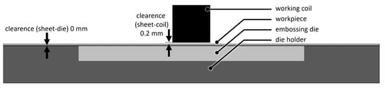 In electromagnetic forming a contactless force transmission is used to realize a high-speed forming process and applied to processing sheet metal with thicknesses greater than 1 mm [] as well as tubes []. During the process, a high current peak is generated by short-circuiting a capacitor bank via a coil. Thus, an electromagnetic field is generated and an eddy current in an electrically conductive workpiece occurs. Due to the repulsive force (Lorentz’ force) between coil and workpiece, the workpiece is accelerated into an embossing die, see Figure 1. In the case of thin sheets, the penetration depth of the magnetic field is larger than the sheet thickness (skin depth > sheet thickness). Thus, the magnetic wave penetrates the die material as well and hence, an eddy current is generated in the forming die. The impact of such a current was investigated by Cao []. He generated the current in the die by using a further tool coil and found that a higher current density in the die enlarges the forming depth. The thickness of the sheet influences also the current density in the primary working coil which in turn affects the magnetic field [].