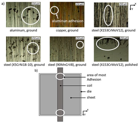 Aluminum adhesion: (a) photos of different ground uncoated die materials after embossing; (b) sketch of the location with largest identified amount of aluminum adhesion.