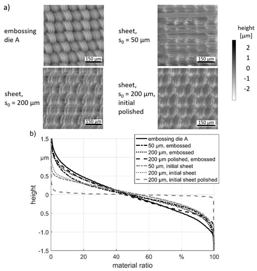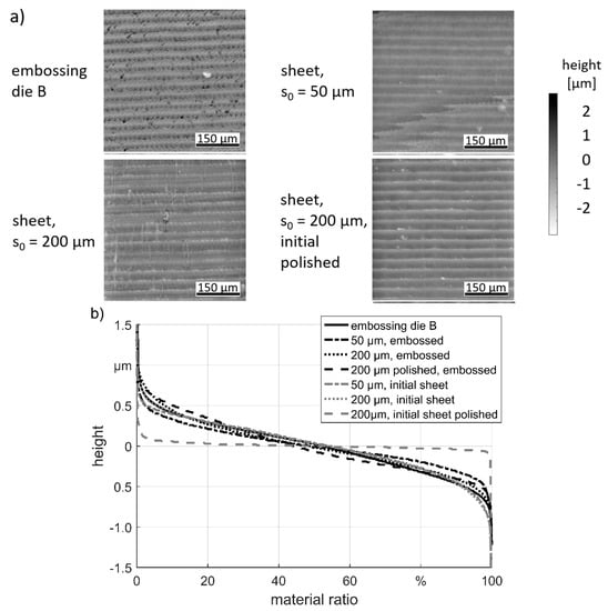 The Abbott-curves of the die with “structure A” as well as of the initial sheets surfaces were compared with the embossing results see Figure 6b. The Abbott-curve of the embossing result was rotated by 180°. The Abbott-curves of the initial polished sheet shows a typical course with a broad plateau. The polished sheet, which showed the best embossing result by visual inspection, fits also best to the Abbott-curve of the die structure. The deviation is biggest in the range of material ratio values between 80–100%, which describes the replication quality of the valleys of the structure. This is the part which is most difficult to emboss. However, the influence of the rolling direction and thus the orientation of the rolling structure must be taken in account. The curve of the embossed sheet with a thickness of s0 = 50 µm confirm the visual inspection and exhibit the highest deviation to the Abbott-curve of the die.